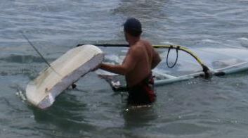 Оказывается в Коктебеле теперь опасно! Бешенные гидроциклисты нападают на серферов и курочат их матчасть :( Пока я спал в тенечке паренек на гидроцикле стартанул от берега везя на тросе плюшку с двумя пляжниками. Так как мозгов у него небыло, то дав максимального газу он заложил дугу на которой оказался начинающий серфер. Серфер ушел в воду раньше – матчасти повезло меньше. Результат столкновения – доска пополам, два окна на парусе порваны. Фотки в отчете.