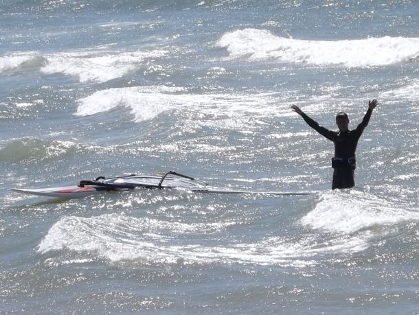 я ему крикнул, что сам его вытяну, хотя он периодически скрывался под водой! Скрутив с Максом парус и вытащив доску мы упорно всматривались во вспененную воду в надежде