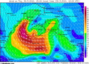 Но самое интересное началось в воскресенье – подуло 10м/с нах, на акватории кое-где разогнало такую волну, что некоторые перцы прыгали вверх на полтора метра. Я катнул пару галсов перед гонками – сразу стало ясно что с фордаками будут траблы, так как меня колбасило непадецки и я даже слегка заочковал. Ну да ладно думаю, ща всех обгоню нах и фсьо такое...