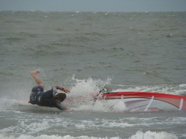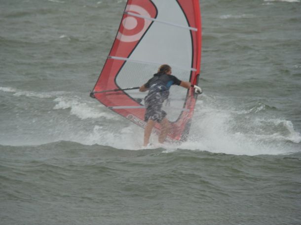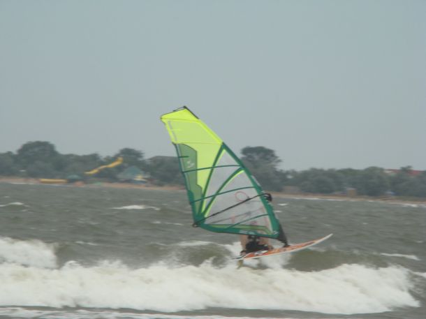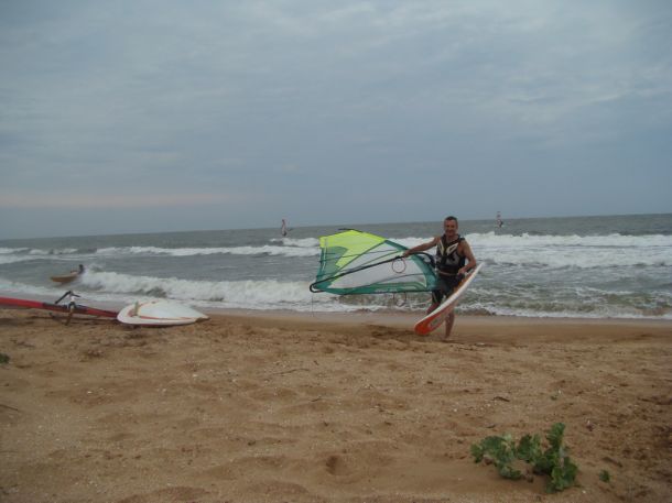Обо всем по-порядку. Вчера слабо, но дуло. Почитав посты про большие паруса и наклеп на МОЙ VMG 9 кв. метров весом в купе в сухом виде в 14 кило и пост Энди не ошибитесь с размером- вчера все сделал наоборот. Фоток нет- катаю один. Кароче к шести вечера все собрал и вышел на воду. Пол-часа туда-сюда- удовольствие. Без трапеции нах.- одними ручками. Грозу и тучи я вдалеке видел. Но как это все быстро налетело... Меня сдуло нах. вместе с VMG с доски в один миг. Хорошо от берега метров 40 было. Шо-то поднимать и делать вотер- старты, когда такое поднялось и в голову не пришло. Еще за спиной рюкзак с кохфем, литрами полтора воды, спальником, и кучей полезных причендал (из тех про которые Сосо писал)... Них. я не плыл- пригнало к берегу само. Я только в воде держался за гик и болтался как червяк за матчастью не хуже чем кайтер за своим змеем. Потом нащупал дно. Дуло и ломало все. Когда я обернулся посмотреть а шо за спиной- чуть глаза не повыбивало ливнем...