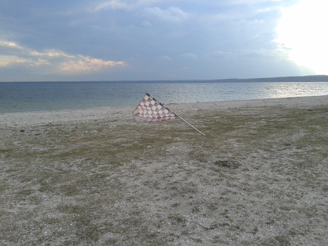 Ветер был странный, сначала дул юго-юго-запад, потом развернуло на запад, а потом еще довернуло на северо-запад и вот тут дало так дало. На споте было четыре кайтера и двое нас виндсерферов. У меня парус 5.9, У кореша доска табу ракета и парус сначала 5.5, глиссировали только на порывах, кореш поменял на 7.5 стало лучше, потом добавило и он опять поменял. А потом стало много. Как то так. Так как я был на воде то сфоткал только потом кайтера, с северной стороны косы. А вот так согнуло флажок воткнутый сантиметров на десять в песок.