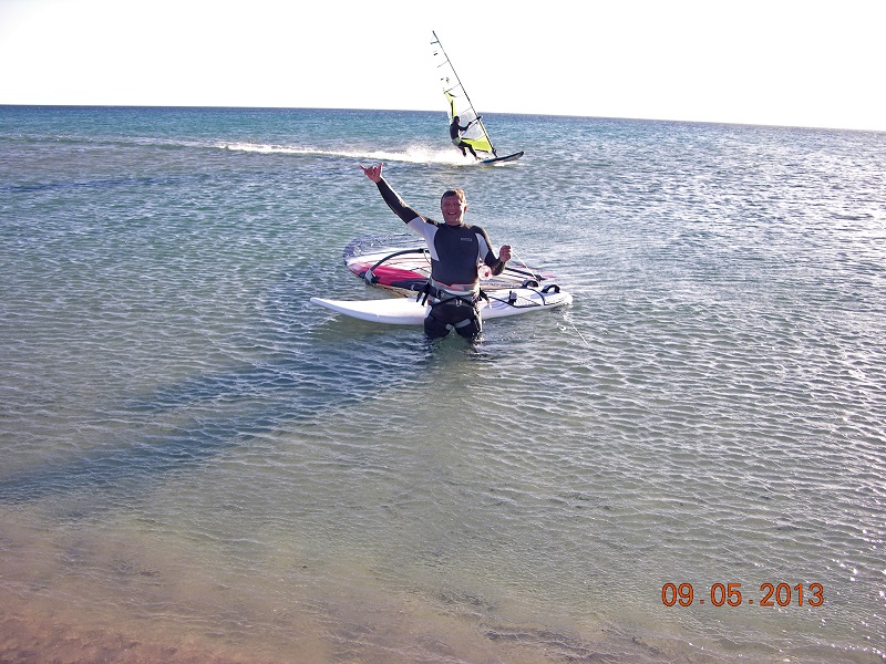 А я катался 10 на лимане на старборд GO 133 с выбитой в "доску" шестёркой.Всё время сильно передозило, разогнался довольно большой чёп и в конце концов под доску поддуло, я перевернулся и воткнулся в дно топом мачты сломал её, ударился головой и потом выгребал от туда минут 40 до ближайшего берега. Парус кстати тоже порвался.