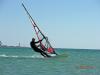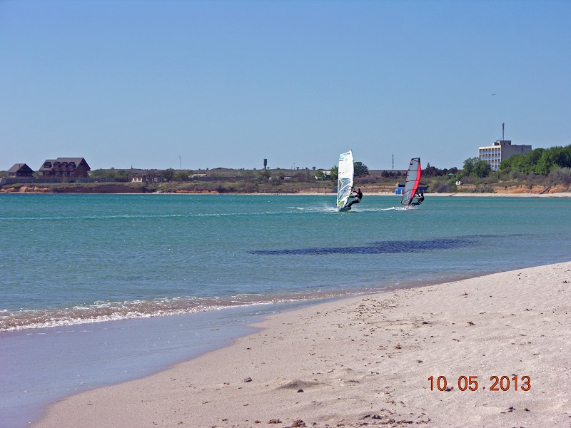 Посмотрели прогноз и собрались ехать в Оленевку после Пасхи на 8, 9,10 мая. По дороге утром 8 мая (часов 8,00 утра) заехали на Бакальскую косу, народа не было, как впрочем и ветра, даже расстроились, что выложили все большие паруса. Приехали в Оленевку на лиман ветерок уже появился, настроение улучшилось, а к 10,00 совсем стало хорошо. Ветер в районе 10 м/с с порывами до 13. На лиман не выходили, сразу на море. Вернулись к палатке часиков так шесть вечера.Праздник Победы 9 Мая тоже порадовал ветерком за 10м/с. На море каталось много народу. Но самый кайф был 10 мая. На море вдоль берега был полный флет, дуло 13м/с с добавлениями до16м/с, катались, такое впечатление по льду. Каталка удалась на славу, просто в удовольствие, напористый, ровный ветер давал возможность без особых усилий разворачиваться фордаком и летать туда и обратно в свое удовольствие целый день, без усталости.