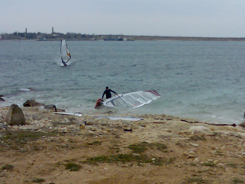 После недельных холодов откиснув дома и придя в себя после всех прошедших праздников наш народ понемногу оклимался и решил восполнить утраченное достойной серфовой каталкой!Вчера все разминались на 6–7ми метровых парусах,но стояла солнечная погодка и поддувал рваненький юго-западный ветер!Правда в яхт-клубе ЮГ двух молодых сёрферов привезли назад на катере-им было многовато на 7-ках(ониж дети...)Пробив прогноз на усиление сегодня собралось человек пятнадцать,хотя на воде я насчитал всего десяток спортсменов.Солнышко нас уже увы,не баловало,но зато довольно стабильный южный ветер 10,порывами до 15м/с дал нам шанс оторваться по полной!Ну а так как ветер дул уже вторые сутки,он сумел таки разогнать волнишку,которая поднималась в районе мели напротив мыса бухты казачьей.Температура воздуха на ветру была 14–15 градусов,а воды+11!Однако я вынужден признать победу киевских и тернопольских льодосьорфоколов,выходящих при более низких температурах без страха падения и без боязни пораниться входя на скорости в глиссирующий фордевинд об острые кромки льда при падении!-Этож травм не избежать!...Так вот после 15–20ти галсов неплохо раскатавшись я не смог сдержаться увидев как 1,5метровая волна плавно накатывает напротив мыса прямо между двумя ветровыми трубами!Взяв неплохой разгон я с довольно большой скоростью в полный бакштаг выхожу на волну,вылетаю,и...проваливаюсь в ветровую яму!Короче говоря я сам не знаю как со всей силой вхожу головой в воду,а вынырнув вижу сою доску метрах в пяти!-Вот это был адреналин!А расстояние в пять метров-как будто пятнадцать,но доплыл быстро!Сделав пару галсов туда-обратно понял,что это первое моё падение в воду с головой(хоть и в шлеме)в этом сезоне-довольно жестковато(прохладновато) получилось!Но пару раз съехав с волны в режиме вейв-райдинг и увидев как Крабик после трёх спидлупов почти доворачивает бэклуп прямо у меня на глазах,быстро разворачиваю доску навстречу поднимающейся уже 2ух метровой волне.Набрав хорошую скорость выпрыгиваю вроде неплохо,но в воздухе меня подхватывает ударный порыв и разворачивает в привод,хотя я лечу в бакштаг!Понимая,что могу неудачно убраться толкаю доску вперёд,а сам катапультируюсь!Вынырнув из уже не такой ледяной воды почему то спиной вперёд вижу,как за мной прокрутив сальто приводняется Краб чётко на доску,парус почти сухой,неплохо!Да и сам то он в сухом сцукокостюме(это модель такая,говорят-круто)!Короче поворачиваюсь я за доской,а она уже в натуре на 15цать метров уплыла!В общем после этого я и катался уже без страха и купался(даже на поворотах) и за матчастью поплавал-ну,в общем сезон открыл понастоящему!Да и не только я!...