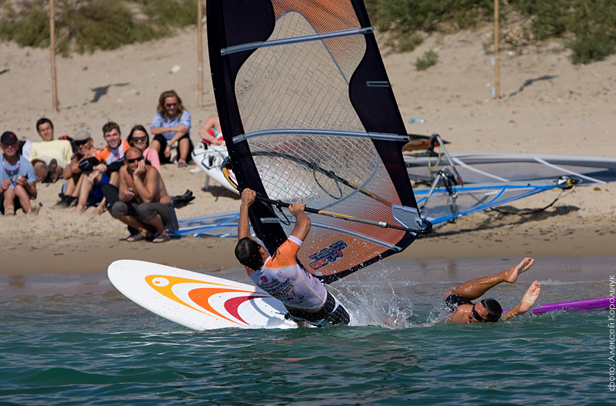 Особенно всем запомнился заезд Михаила Кутькова и Дмитрия Давиденко, которые сначала на берегу забирали друг у друга матчасть, а потом, уже на воде помогали друг другу выполнять сложнейшие «uborka-nowind» – элементы фристайла, которые всегда оцениваются по максимуму судьями и вызывают дикий восторг у зрителей. Некоторые спортсмены были уличены в применении перед заездами нефильтрованного допинга, но обошлось без протестов. Соревнования проводились по системе double elimination и завершились только к вечеру.