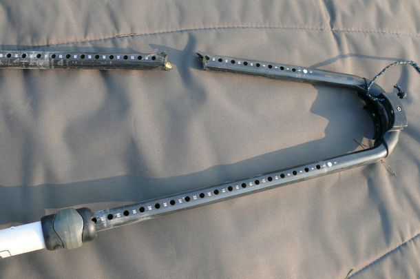 Для мене якось воно дивно виглядає. Я не маю багатого досвіду ломання гіків, але якось чув, що найбільше ломаться передня/задня оковки, трубу можна вигнути, але про такий варіант як у мене я ще не чув. Трісла алюмінієва труба всередині передньої оковки і я, падаючи, потягнув ту відломану частину, ну і зломав карбонову задню частину. На фотках детально видно місце злому.