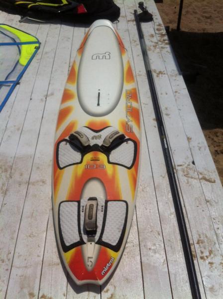 Доска в отличном состоянии, целая, палуба и дно без повреждений, защита на носу. В комплекте петли, плавник и чехол. Есть парус Simmer 4,7.