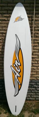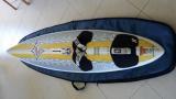 Доска в отличном состоянии, целая, палуба и дно без повреждений, защита на носу. В комплекте петли, плавник и чехол. Есть парус Simmer 4,7.